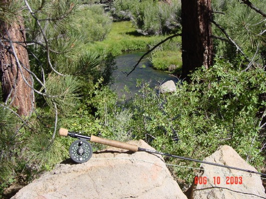 :: Saturday, August 9, 2003 @ 9 AM:: We got started a little bit later than we had planned, and part of the reason was that we woke up later than planned and the other part was that we had to get more things ready before we could pack the truck. But we finally got everything together and we headed out of town. We stopped along the way for groceries, gas, and fishing licenses.:: Saturday, August 9, 2003 @ 1 PM :: Our route to the Eastern Sierras took us onto highway 120 through Yosemite National Park and Yosemite's Tioga Pass. The views along this stretch of road were magnificent, and we stopped along the way to have lunch. We made turkey sandwiches. Once we were through the park we headed on to Lee Vining and then got onto highway 395 and headed south.:: Saturday, August 9, 2003 @ 7 PM :: Our first try at finding a campsite took us to Convict Lake. This is a beautiful little lake set against the Eastern Sierras with dark blue water. The sign leading up to Convict Lake said that it was full, but we decided to give it a try anyway. And you know what? The sign was right. But that's ok, because the campsites weren't that great and they didn't have any showers. Our next try at camping came at McGee Creek. We drove up a road to the more rugged camping area and didn't find anything. As we headed down toward the highway we decided to drive through the RV park to see if they had any campsites. We didn't see any, but we decided to check in the main office. I asked the lady in the office if they had any campsites open and she said campsite 16 was open. So we went and checked it out and decided to take it. I was right on McGee creek and she said that it had just been stocked with trout the day before. She said that they also had a couple of trout ponds that could be fly fished for $10 an hour if we were interested. Once we got our stuff unpacked I started to get the fishing gear ready. I decided to try a spinner with my telescope rod on McGee creek and on my third cast I caught an 11 inch Rainbow trout. Little did I know that this would be the largest fish I would catch on this trip.:: Saturday, August 9, 2003 @ 8 PM :: After we were situated in our campsite we decided to go scout out the fishing locations. We drove to Owens River road and went down the dirt road for a few miles. We stopped at a campground that was right on the river. I decided to give the fishing a try there, so I got all my gear ready and walked over to the river from where I parked. But the mosquitoes here were horrible. I haven't seen mosquitoes this bad since being on the tundra in Alaska. I tried to put insect repellant on but it really didn't seem to deter the mosquitoes. So I just decided that I would donate some blood so that I could fish and I went on and fished anyway. Christina couldn't take the mosquitoes anymore so she went back to the truck and watched me fish from a distance. I saw some fish coming to the surface, but they seemed to only be small ones. And since it was getting dark already I didn't have much time to waste, so I started casting where I thought the fish might be. After a few minutes I caught a small brown trout and then moved down stream a little ways. There was no further activity and I decided to pack up and check out the other places. We drove down the dirt road and tried to find other places to access the Owens River but were unsuccessful. We worked our way over to the Big Springs campground and tried looking around for the river. By this time it was too dark to really be able to see anything so we headed back to the highway and then on to our camp at McGee Creek.:: Sunday, August 10, 2003 @ 8 AM :: we woke up later than I wanted, but we hurried and ate breakfast and headed for the upper Owens River. We went back to the Big Springs campground and parked by the river and walked downstream a ways. We found a small pool and I had Christina practice putting her fly in the water and studying where the water takes it and how it acts in a river. I demonstrated how to cast and while I was demonstrating I got a hit. Then I spent some time watching her cast and giving her pointers and then we decided to move on. We worked our way downstream about a mile until we came to the private property marker. We stayed at that spot for about an hour and a half trying to catch the fish that we saw. Christina ended up catching a beautiful rainbow trout here, but other than that we had no success on this stretch of the Upper Owens River. It was very challenging for a lot of reasons. First, there were so many trees and so much brush that it was hard to cast fly line any considerable distance. Also, the water ran fairly fast and the pools that the fish were holed up in were deep, not to mention tons of overhanging branches that made it nearly impossible to get a fly down to where the fish were. I used weights on my flies so that I could get my fly to where the fish were, but once I presented the fly to them, they didn't bit. I tried tons of different flies and even tried spinners, but I had no success. We decided to head up river, and along the way we spotted a marmot that was spying on us. We tried a few more spots on the way back to the truck but we didn't have any success.:: Sunday, August 10, 2003 @ 2 PM :: After getting our butts kicked we went back to camp, put our things away, and headed to the Mammoth Lakes area. Neither of us had ever been there before, so on the way into the town of Mammoth we decided to check out the visitor center. We saw on one of the message boards that a backpacker was three days overdue. After the visitor center we drove through town and back to see all the lakes in the area. Some of them were gorgeous. We saw that at Horseshoe Lake there was an eruption or something that killed a lot of the trees. They say that there is a lot of Carbon Dioxide in the soil, and as a result it didn't look like anything lived in the lake. There were a lot of people down at the lake with their dogs. After we we